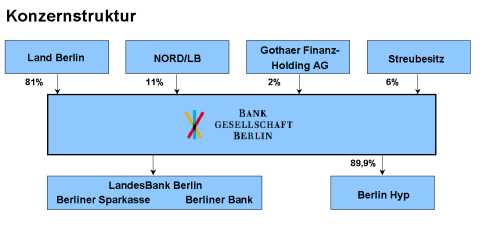 Die Bankgesellschaft Berlin ist ein innovatives, kundennahes Kreditinstitut der deutschen Hauptstadt-Region. Mit der Gründung eines einheitlichen Konzerns haben wir 1994 eine Verbindung öffentlich-rechtlicher Strukturen und der privatrechtlichen Gesellschaftsform einer börsennotierten Aktiengesellschaft geschaffen. Im Dezember 2001 gab die Bankgesellschaft Berlin eine tief greifende Sanierung bekannt. Diese beinhaltet auch eine weitgehende Konzentration auf das Geschäftsgebiet Berlin-Brandenburg und auf das Retailgeschäft.